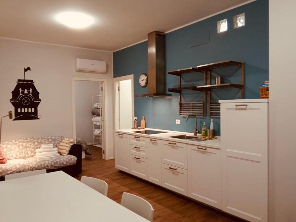 Disposizione: Stanza con letto matrimoniale, stanza con letto a castello, zona giorno con divano letto matrimoniale con cucina attrezzata, piano ad induzione e tavolo da pranzo, bagno con doccia e bidè.
