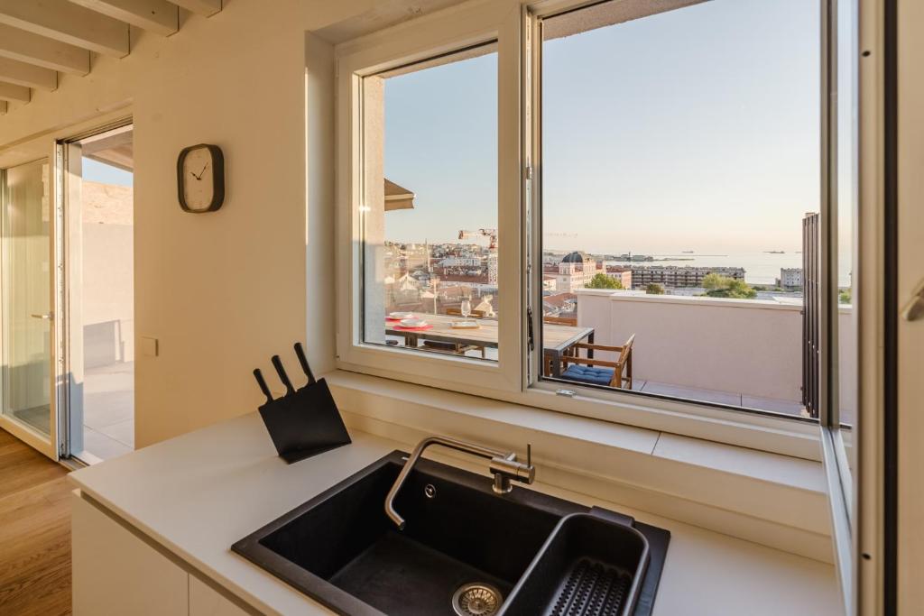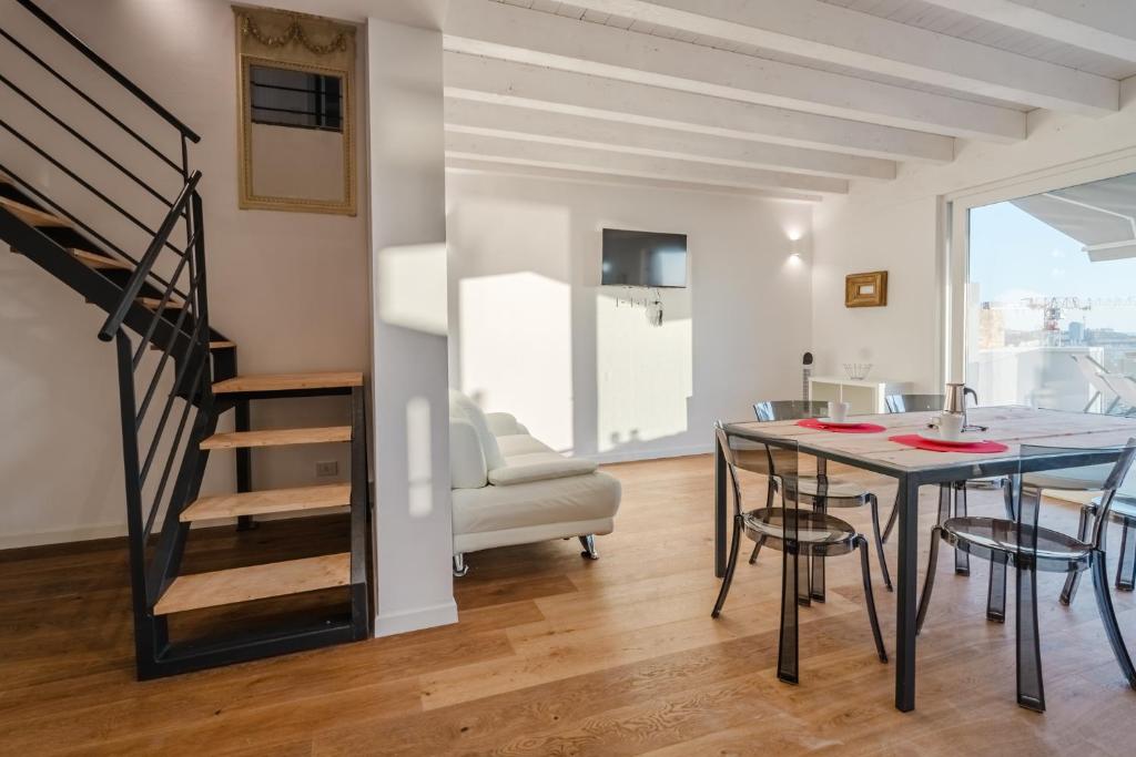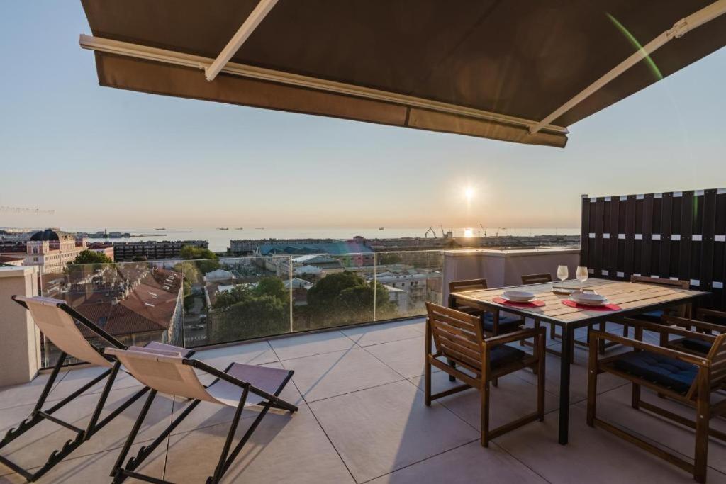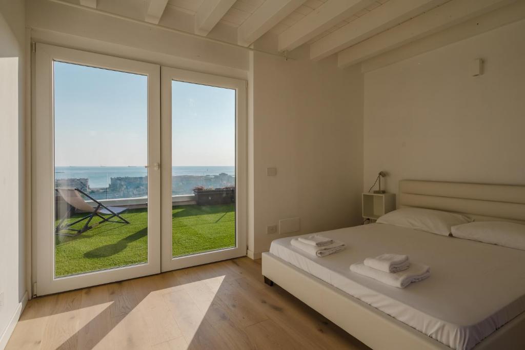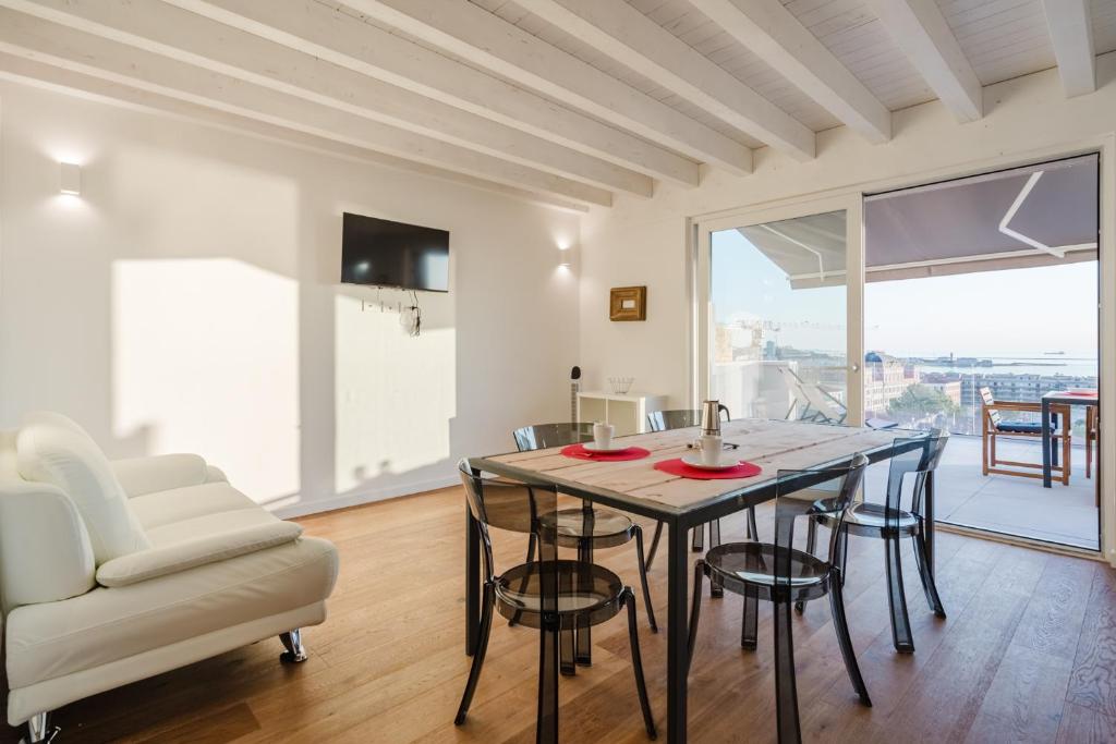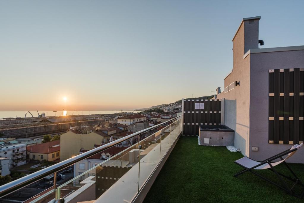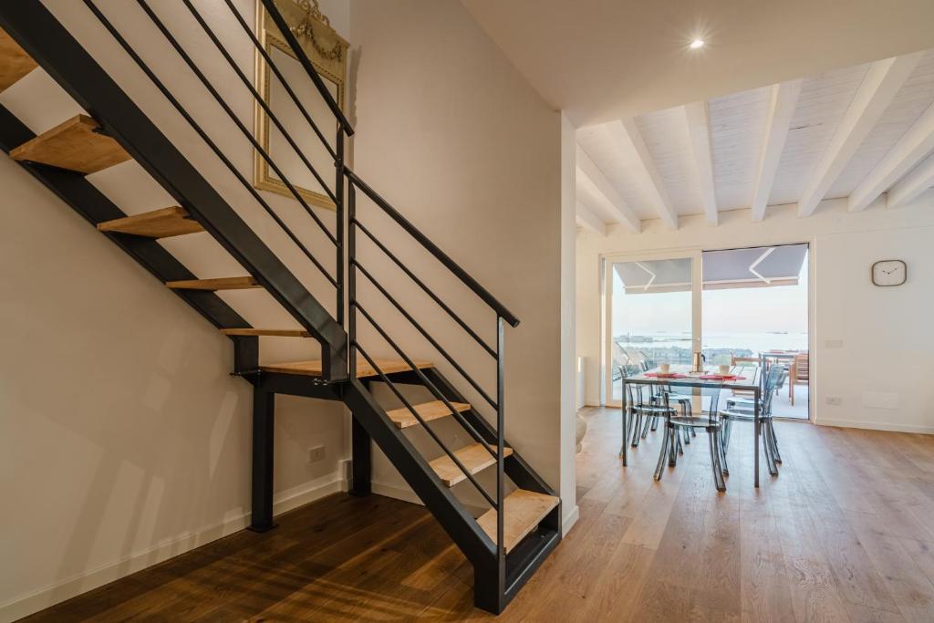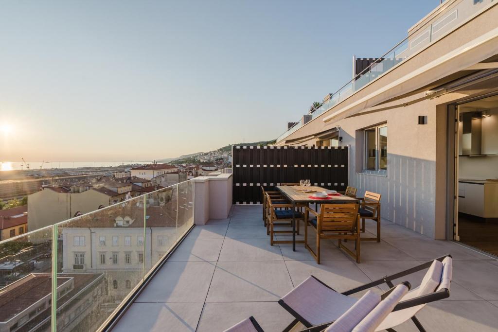 Disposizione: Ottavo piano – 3 stanze matrimoniali con ampi armadi, 2 bagni di cui uno all’interno della camera da letto, salotto con divano, tavolo da pranzo e TV, cucina attrezzata con lavastoviglie, bollitore, piano ad induzione, frigorifero a colonna con freezer, terrazza vista mare con tavolo esterno e vasca idromassaggio riscaldata con vista aperta sul mare e sulla città di Trieste, ripostiglio con lavatrice, asciugatrice e scopa elettrica. Piano nono – tramite scala interna si accede al nono piano e alla terza stanza da letto con letto matrimoniale, armadio e terrazzi sia sul fronte che sul retro. Nelle terrazze del nono piano si gode della vista aperta sul mare e sulla città di Trieste.